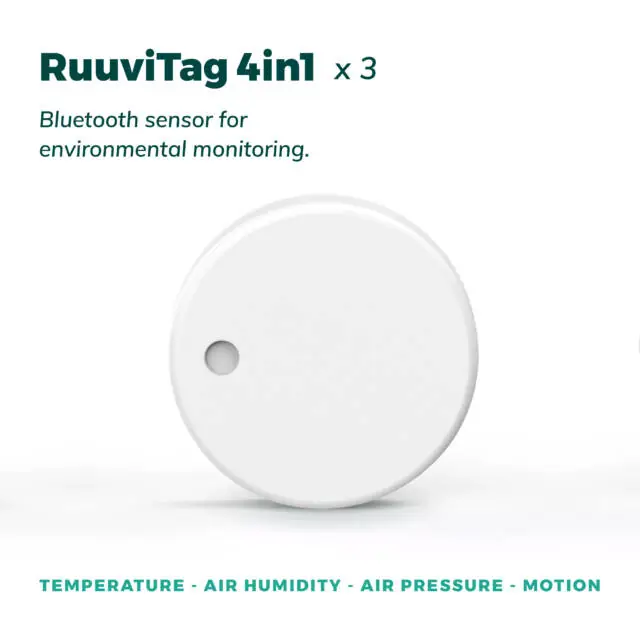 Acest pachet permite utilizatorilor să măsoare temperatura, umiditatea, presiunea aerului și mișcarea în multiple locații (ex: dormitor, frigider, curte). Senzorii se conectează prin Bluetooth la aplicația mobilă gratuită Ruuvi Station, oferind date în timp real și alerte personalizate atunci când telefonul se află în raza de acțiune.