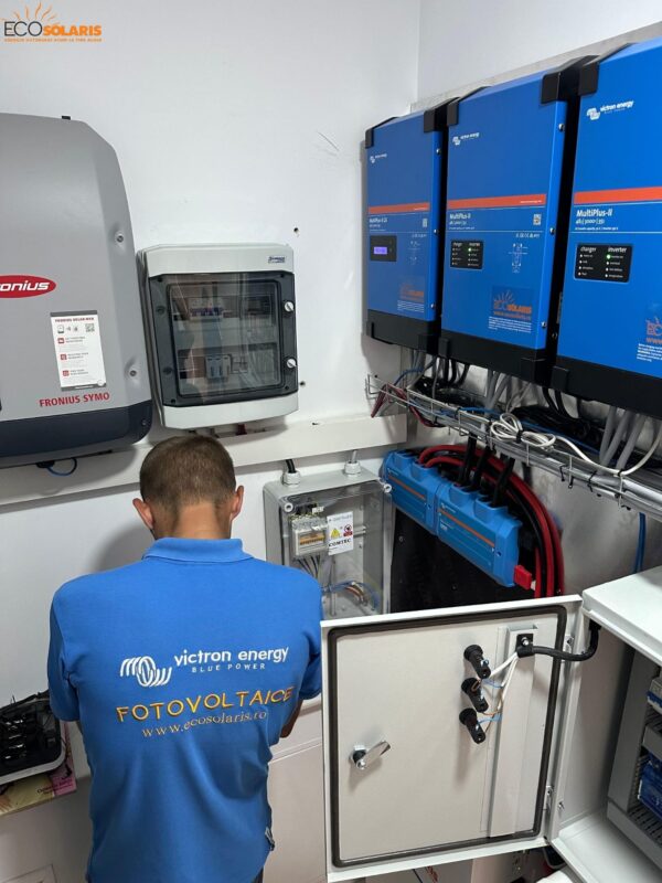 Sistemul prezentat aici este construit în jurul unei arhitecturi echilibrate, fără excese de putere, dar cu un nivel ridicat de control, modularitate și fiabilitate. Configurat în jurul tehnologiei Victron Energy și al bateriilor LiFePO₄ de la EcoSolaris, acesta livrează o capacitate de stocare de 30 kWh și o putere de ieșire continuă de 6 kVA – mai mult decât suficient pentru un consum casnic constant, dar și pentru aplicații critice în regim off-grid sau hibrid.
