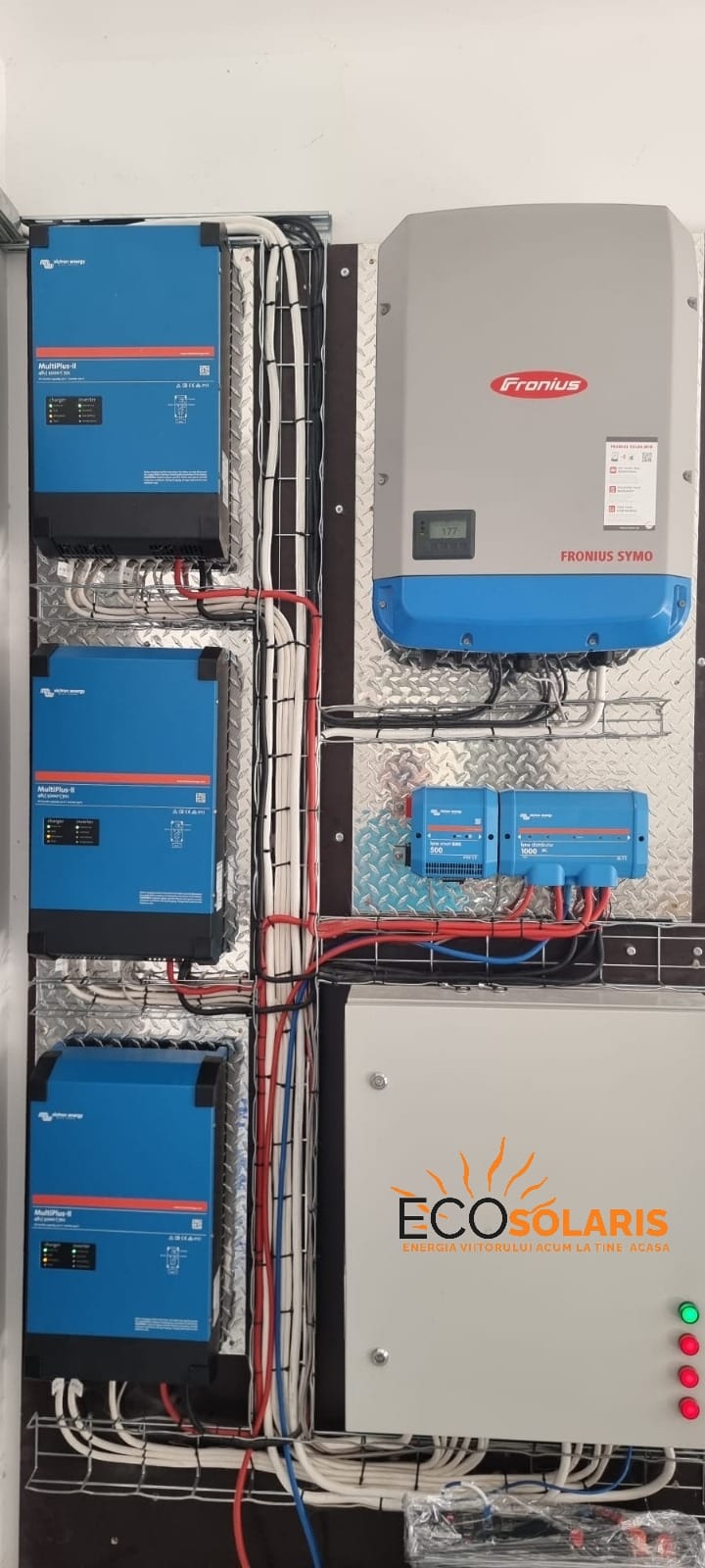 MultiPlus 48/5000 Victron Energy - 3 produse: Aceste invertoare multifuncționale combină funcțiile de conversie a curentului (DC-AC), încărcare a bateriilor și comutare automată între surse de energie (solar, baterii, rețea). Flexibilitatea și fiabilitatea lor sunt esențiale pentru funcționarea optimă a Micro-Grid-ului. În plus, permit injectarea surplusului de energie produsă în rețeaua publică.